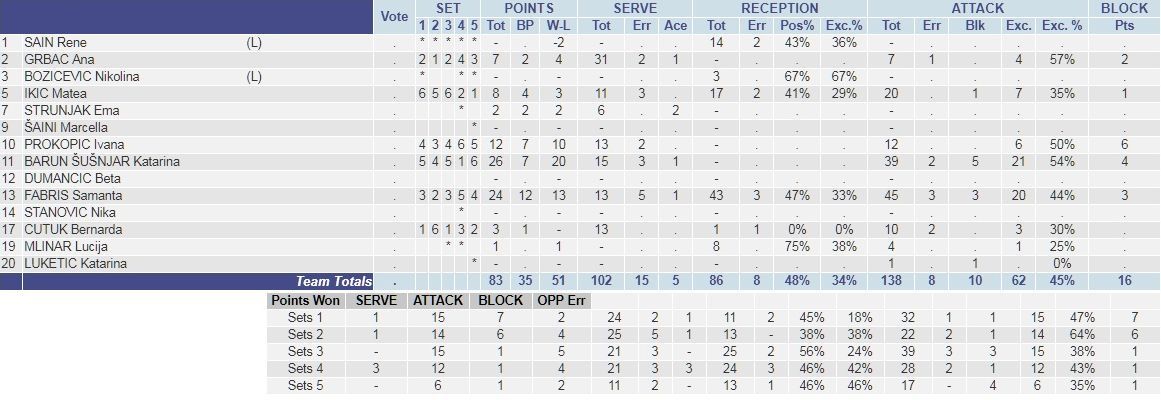 Naše reprezentativke najprije su odličnom igrom ‘razbile’ u prva dva seta ekipu Bjelorusije, da bi potom došlo do drastičnog pada u igri. Bjeloruskinje su se potom vratile u igru, te dobile sljedeća tri seta. Premda je na tragičan način izgubila susret s Bjelorusijom, nisu izgubljene šanse za plasman u drugi krug natjecanja jer u subotu Hrvatska igra s reprezentacijom Gruzije, koja je po općoj ocjeni najslabija ekipa naše kvalifikacijske skupine.