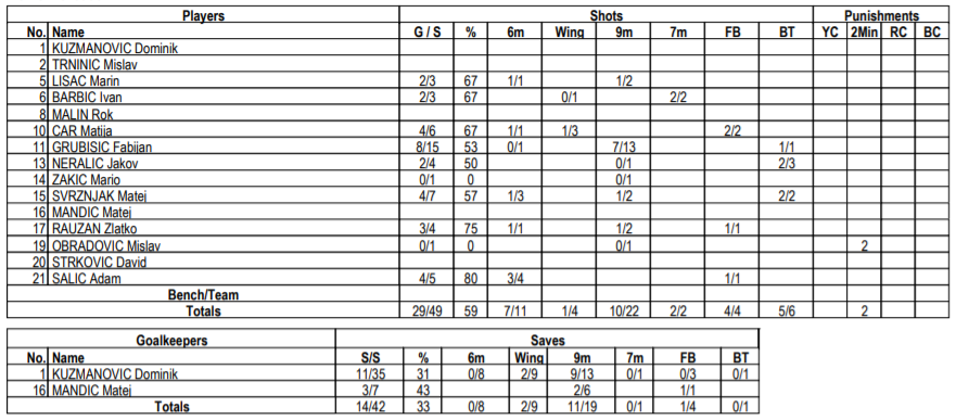 Fabijan Grubišić s osam pogodaka bio je najbolji strijelac Hrvatske u finalu, a na kraju je i najbolji strijelac turnira s 39 postignutih golova. Dominik Kuzmanović je u pobjedu vrijednu zlatne medalje ugradio 11 obrana.