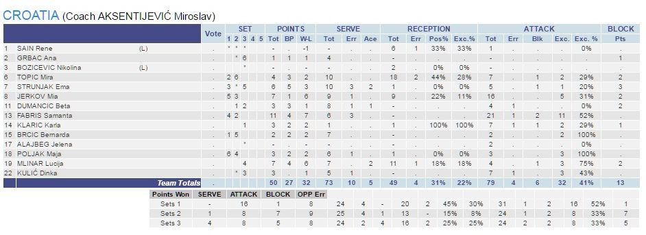 Najefikasnija u napadu bila je Samanta Fabris s 11 poena, a potom slijede Jerkov i Mlinar s po sedam poena, Ema Strunjak sa šest, Topić s četiri te Poljak i Kulić s tri poena.