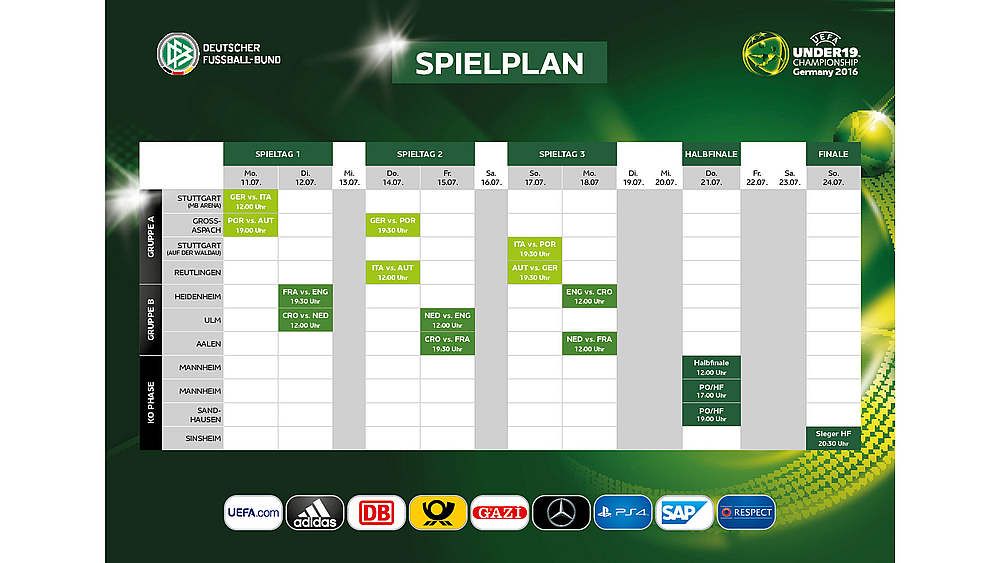 Hrvatska je smještena u skupini B, a natjecanje otvara s Nizozemskom 12. srpnja u 12 sati u Ulmu. U petak 15. srpnja od 19.30 sati suparnik je Francuska u Aalenu, dok je 18. srpnja U-19 reprezentaciji protivnik Engleska u Heidenheimu.