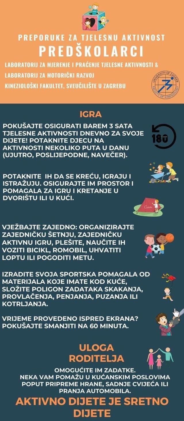 “Djetinjstvo je razdoblje života obilježeno snažnom unutrašnjom potrebom za kretanjem, a u ovim izvanrednim okolnostima većini su djece prilike za tjelesnu aktivnost znatno umanjene. U trenutnoj situaciji u kojoj nisu dozvoljene organizirane aktivnosti, apeliramo na roditelje da u zgusnutom dnevnom rasporedu svakako pokušaju odvojiti vrijeme za obiteljske aktivnosti na otvorenom i zajedničku igru s djecom,“ dodaje doc. dr. sc. Maroje Sorić.