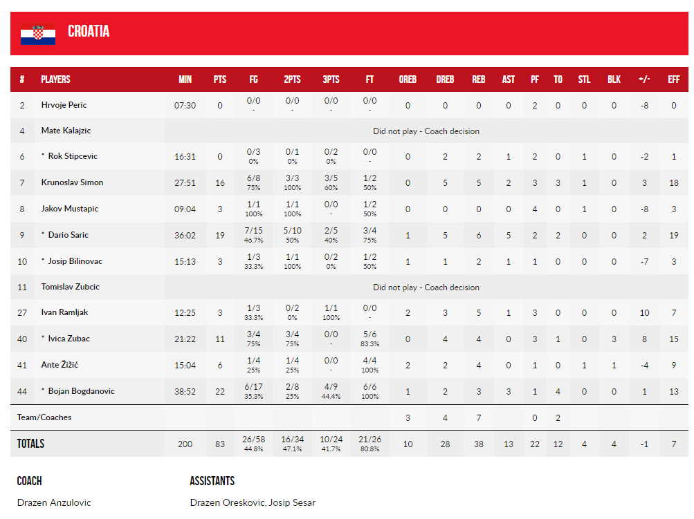 Bojan Bogdanović ubacio je 22 poena, dok je Dario Šarić upisa 19 koševa, šest skokova i pet asistencija. Krunoslav Simon dodao je 16 poena, a Ivica Zubac 11 poena i tri blokade.